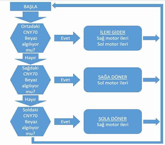 Sensörleri robotun çizginin neresinde olduğunu (sağında , üstünde solunda) saptamak için ön kısmına yerleştirilir. Eğer robot çizginin sağında kalıyorsa sağdaki sensör çizgiyi algılayarak sinyali yollar ve robotun piste doğru yönelmesi için sol motorun ileriye doğru çalışması sağ motorun ise bu sırada durması gerekmektedir. Bu algoritma robotumuzun viraj almasını sağlar.