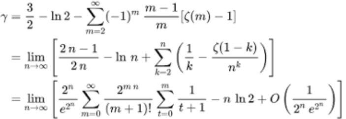5-) Euler sabiti ya da Euler-Mascheroni Sabiti, ϒ (gama) ile gösterilir ve matematiksel sabittir. Harmonik seri ile doğal algoritma arasındaki limit veya farktır. Sayısal değerinin ilk 10 basamağı: 0.5772156649