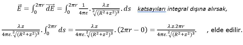 ifadesi aslında halkadaki toplam yükü verdiği için bu kısma “q” denilebilir. Ve z’ler birbirini götürürse; q/(4πε.z^2 ), halka merkezinden çok uzaktaki bir noktada oluşan elektrik alanı verir.