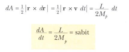 Bu sonucu şu geometrik düşünceyle anlatabiliriz. Şekil b’deki r yarıçap vektörü, bir dt zamanında dA alanını süpürür. Bu alan r ve dr vektörlerinin oluşturduğu paralel kenarın | r x dr | alanının yarısına eşittir. Gezegenin bir dt zamanındaki yer değiştirmesi dr = v dt ile verildiğinden aşağıdaki durumu elde ederiz.