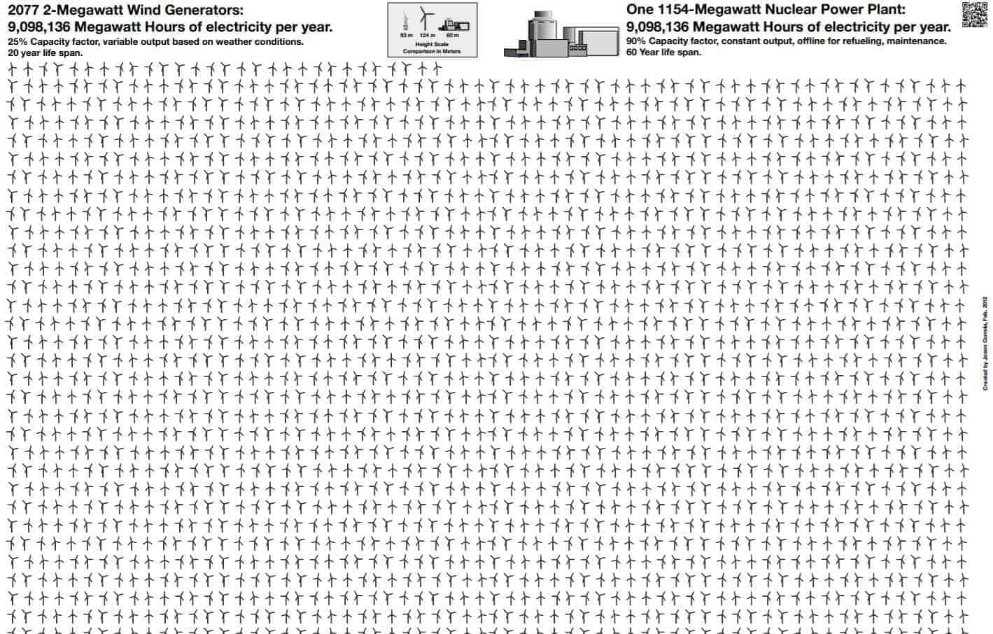 Bu karşılaştırmada ise 1 yılda 9,098,136 MWh elektrik enerjisi üretmek için; 2077 tane 2 MB’lık rüzgar gülü, 1 bloğa sahip 1154 MB nükleer enerji santraline denk geliyor. (Rüzgar gülleri %25 kapasite ile 20 yıl, nükleer enerji santralleri %90 kapasite ile 60 yıl çalışabilmektedir.
