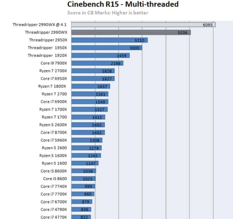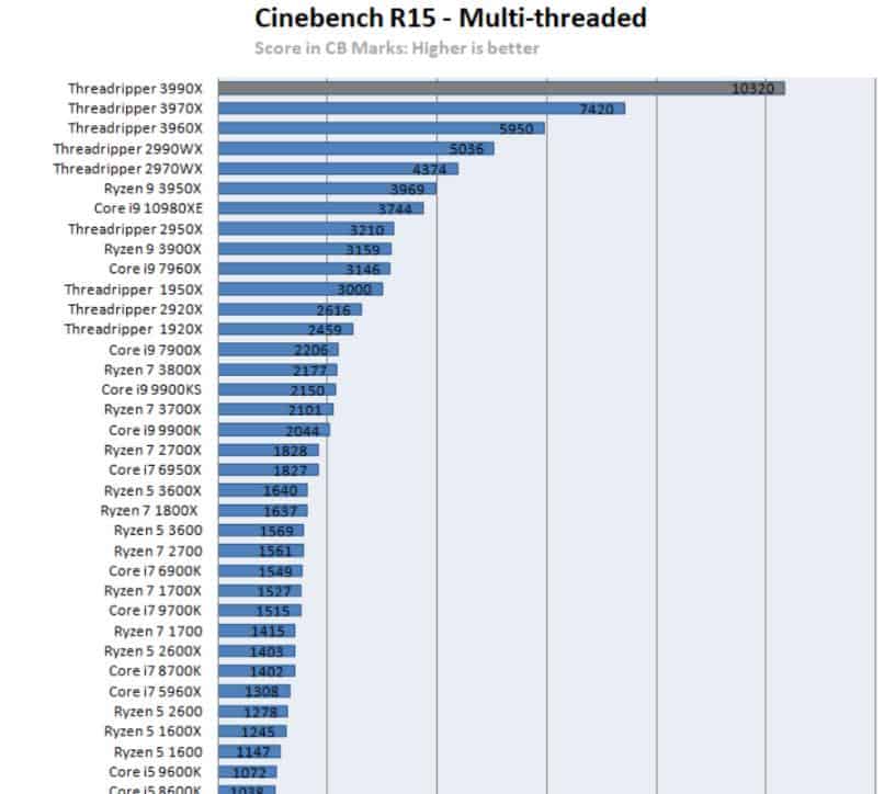 Cinebench toplam kas gücünü ölçmede en iyi alternatiflerden biridir ancak işlemciyi her açıdan test etmez. Yine de grafik tasarımla uğraşan şahıslar tasarladıkları grafikleri veya videoları işlerken Ryzen işlemcilerden daha iyi bir alternatif bulamaz. En iyi i9 ile son çıkan Threadripper arasında 3 kat performans farkı vardır, elbette Threadripper lehine. Öyle ki, en iyi 2 Xeon işlemci yanyana kullanılsa bile son çıkan Threadripper işlemci bu kas gücünde bench testini daha başarılı tamamlamaktadır.