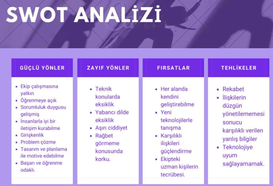 SWOT analizi sonucunda, bu dört adımın sonuçlarını karşılaştırırız ve başarıya yönelik hedeflerimizi stratejik olarak nasıl ilerletebileceğimize dair düşüncelerinden faydalanırız.