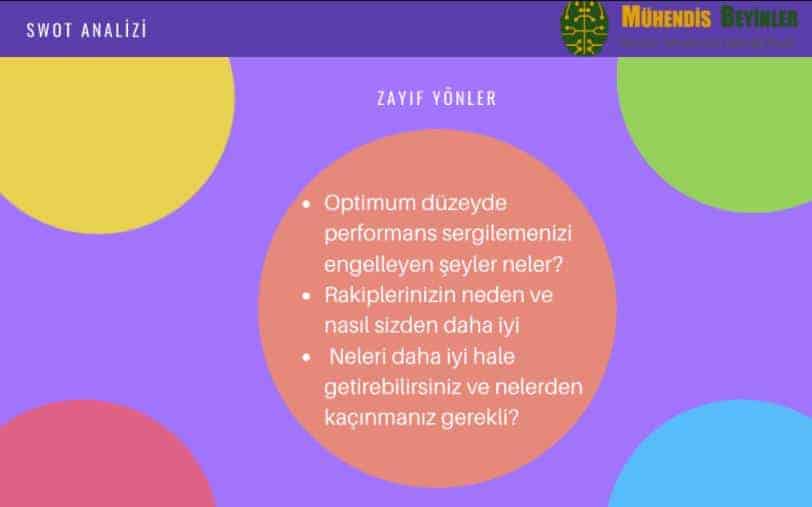 Şimdi de işletmenizin zayıf yönlerini düşünme vakti. Bir SWOT analizi yalnızca ihtiyacınız olan tüm bilgileri topladığınızda değerli olacağı için bu konuda dürüst olmak gerekir. Bu sebeple bu acı gerçeklerle bir an önce yüzleşmek en iyi karar olacaktır.